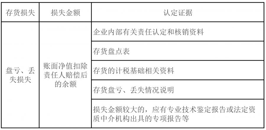 企业所得税方面:对于存货盘点发现的盘亏损失,应按照国家税务总局关于发布《企业资产损失所得税税前扣除管理办法》的公告(国家税务总局公告2011年第25号)办理,按规定办法计算损失金额,并按规定准备认定证据等。如下表: