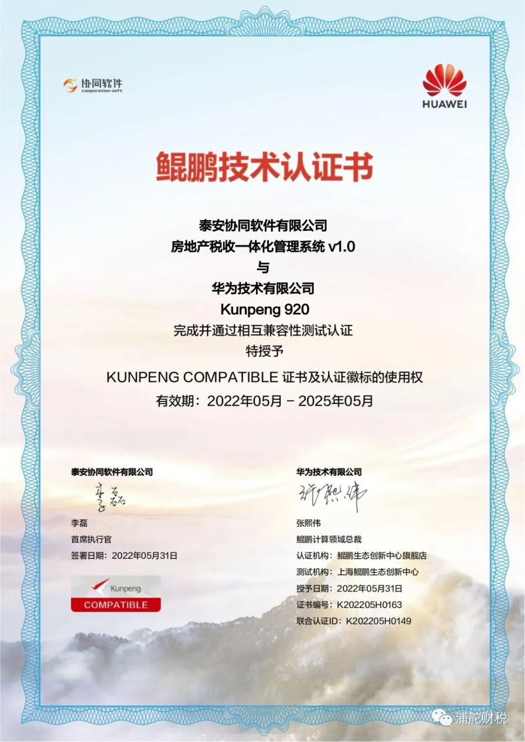 协同软件自主研发的“房地产税收一体化管理系统”获得鲲鹏技术认证书