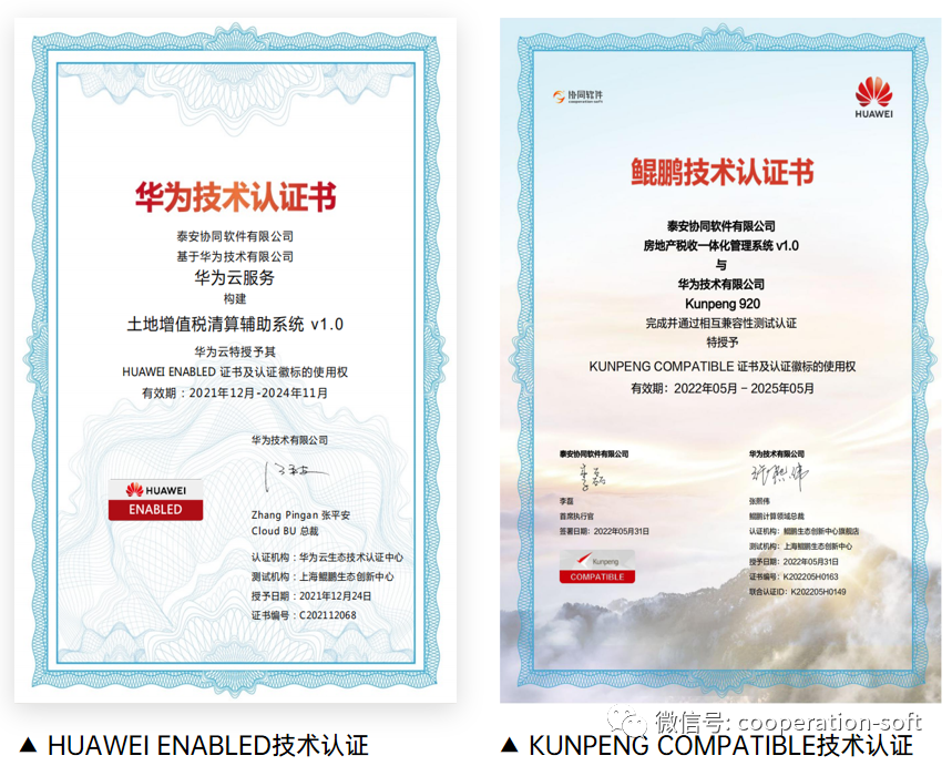 近日,协同软件作为华为“沃土云创计划”认证伙伴,自主研发的“房地产税收一体化管理系统”顺利完成华为云鲲鹏云部署兼容性测试验证,被授予华为鲲鹏技术认证书。