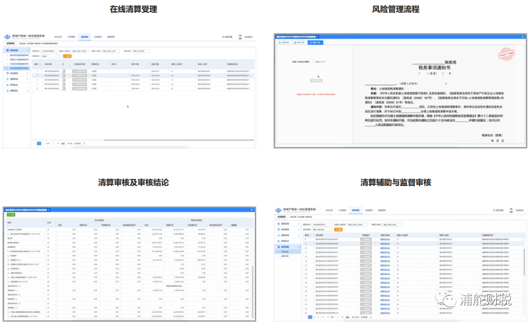 应用系统内置的标准化、规范化土地增值税清算工作流程进行线上清算受理与清算审核;应用内置的6大类300多指标进行自动风险检测并生成疑点数据和应对方向,为税务局约谈和第三方审核提供有力的凭据;