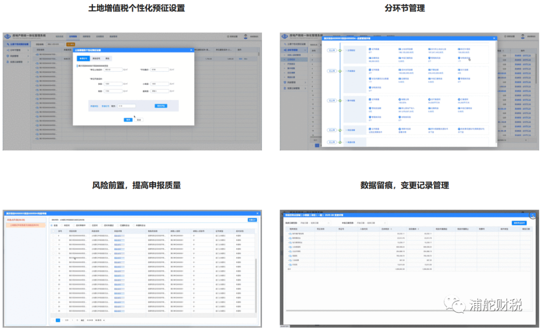 对土地增值税个性化预征进行添加修改;对房地产项目“立项规划-开发建设-开发建设-集中销售-项目清算-尾盘处置”进行分环节管理;